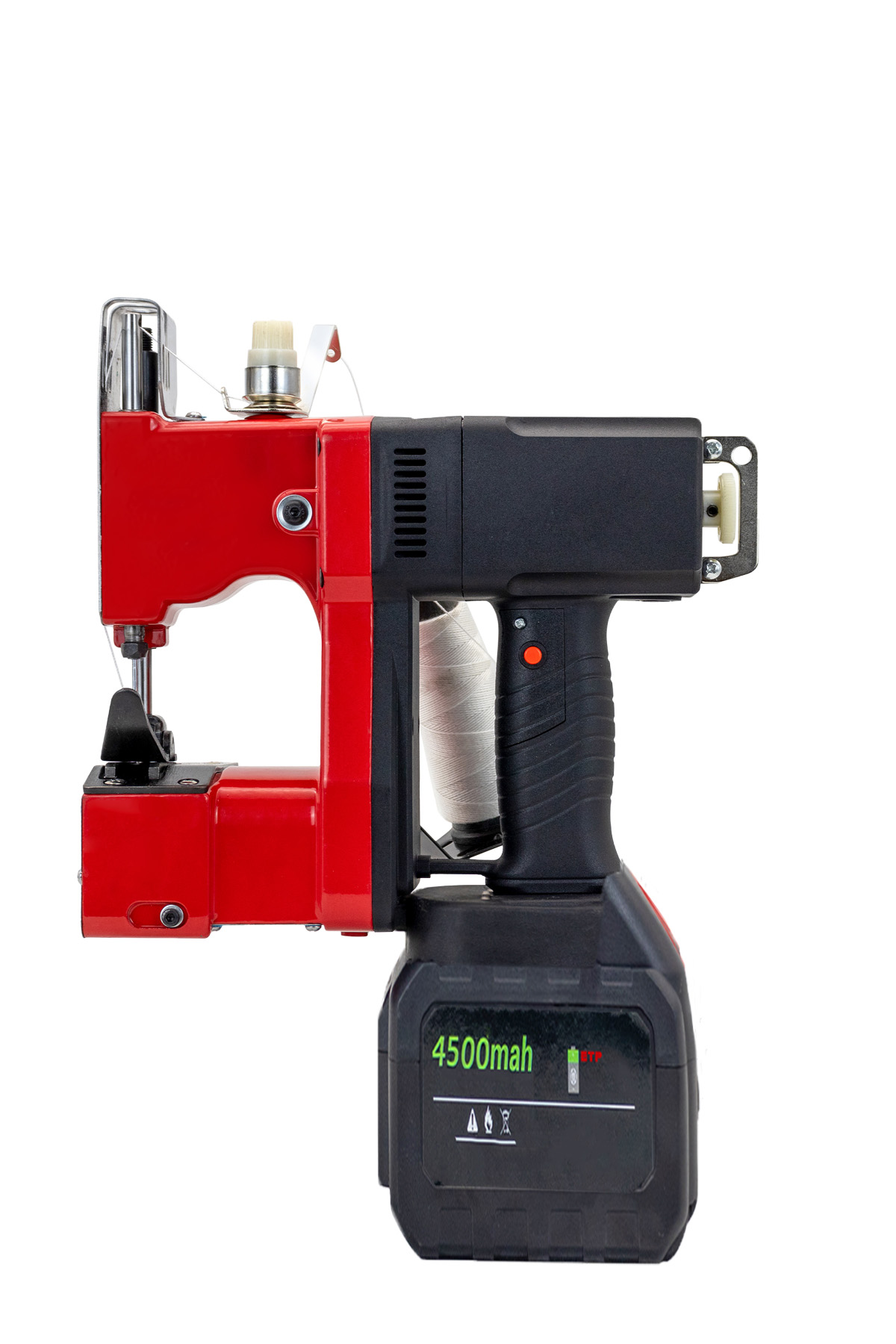 Profesyonel kullanıma uygun şarjlı ve akülü çuval ağzı dikme makinesi, 4500 mAh yüksek kapasiteli bataryasıyla uzun süreli ve kesintisiz kullanım sunar.